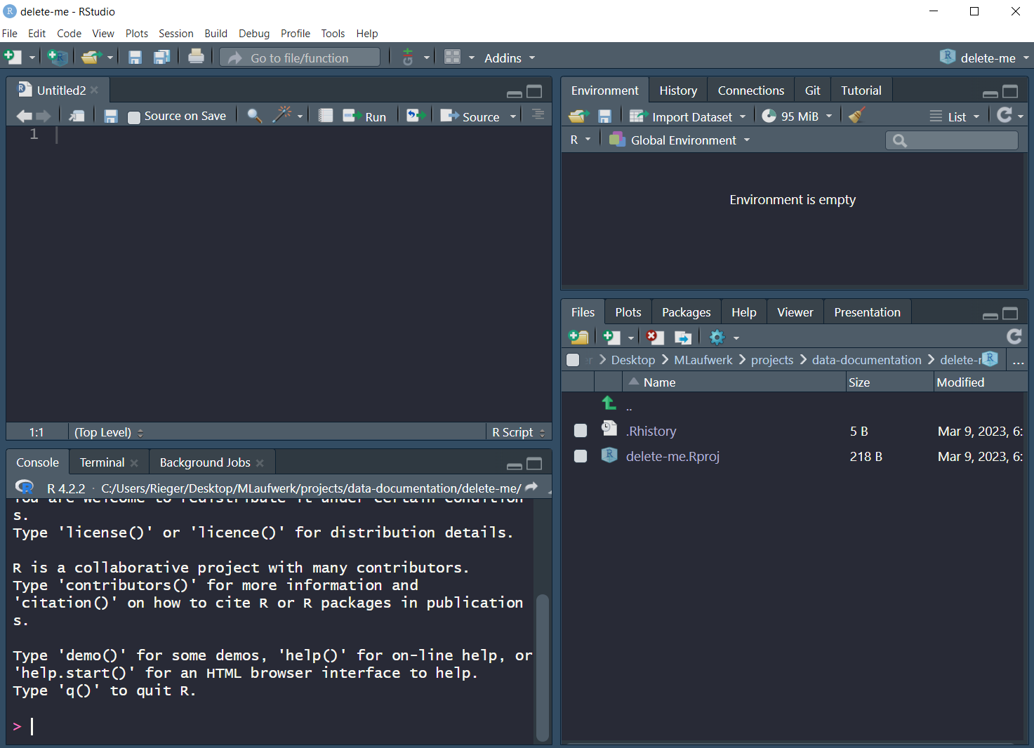 2 + 2You should never work directly in the Console, but always use a R-script (e.g., script.R) or even better a Quarto document (e.g., script.qmd). It is important to understand and reproduce everything you did.